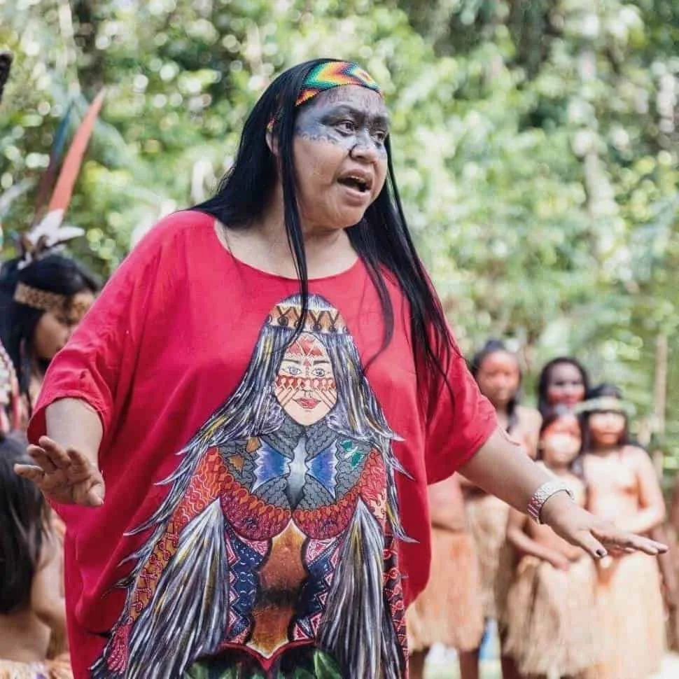 Amongst the projects she leads is the centre for education in Mutum, the production and sales of Rauti (artwork) over 7 villages, the reforestation project in Mutum and the reforestation project Waivãna. She works to support many within the Yawanawá family, not restricting herself to her own village, with a focus on working with women.